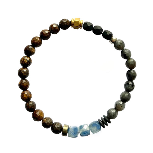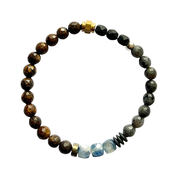 The colour combination of beautiful beads sourced from around the globe give an unusual twist to this bracelet. It's subtle enough to be worn on an everyday basis. The bracelet is strung with Bronzite, Kyanite, Labradorite, Hematite, sterling Silver, vintage Glass and Brass.